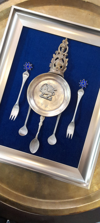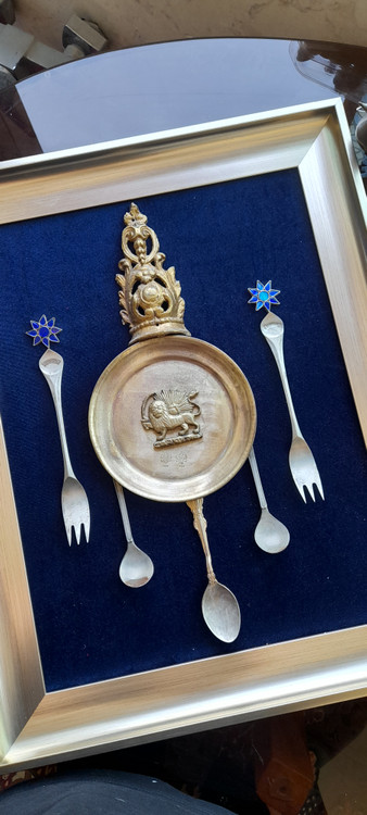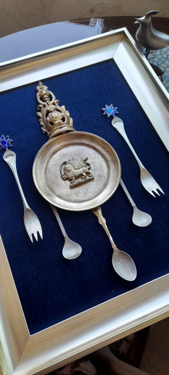 ظروف داخل تابلو با قدمت بالای ۵۰ سال هستن و جنس ظروف برنج مهردار و رنگ مخمل هم سورمه ای است