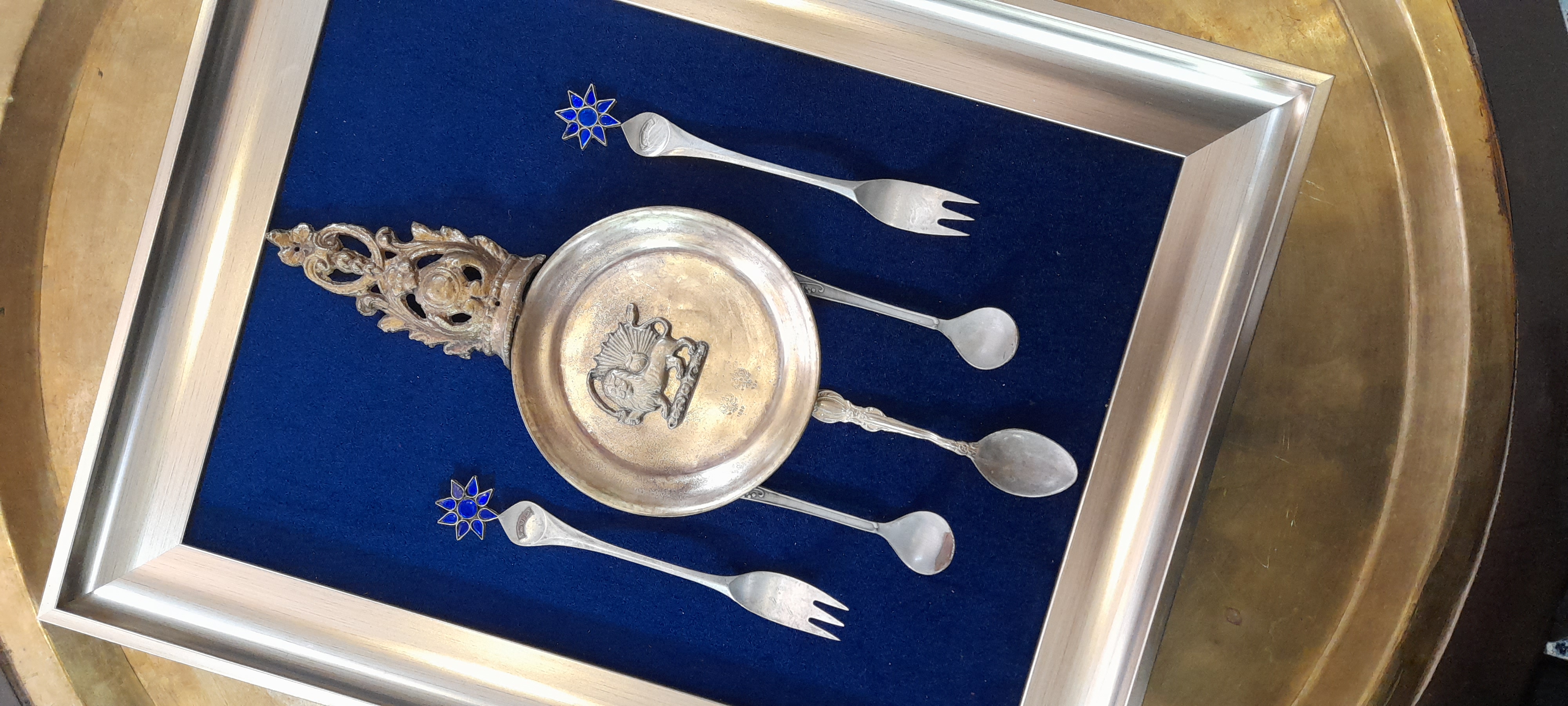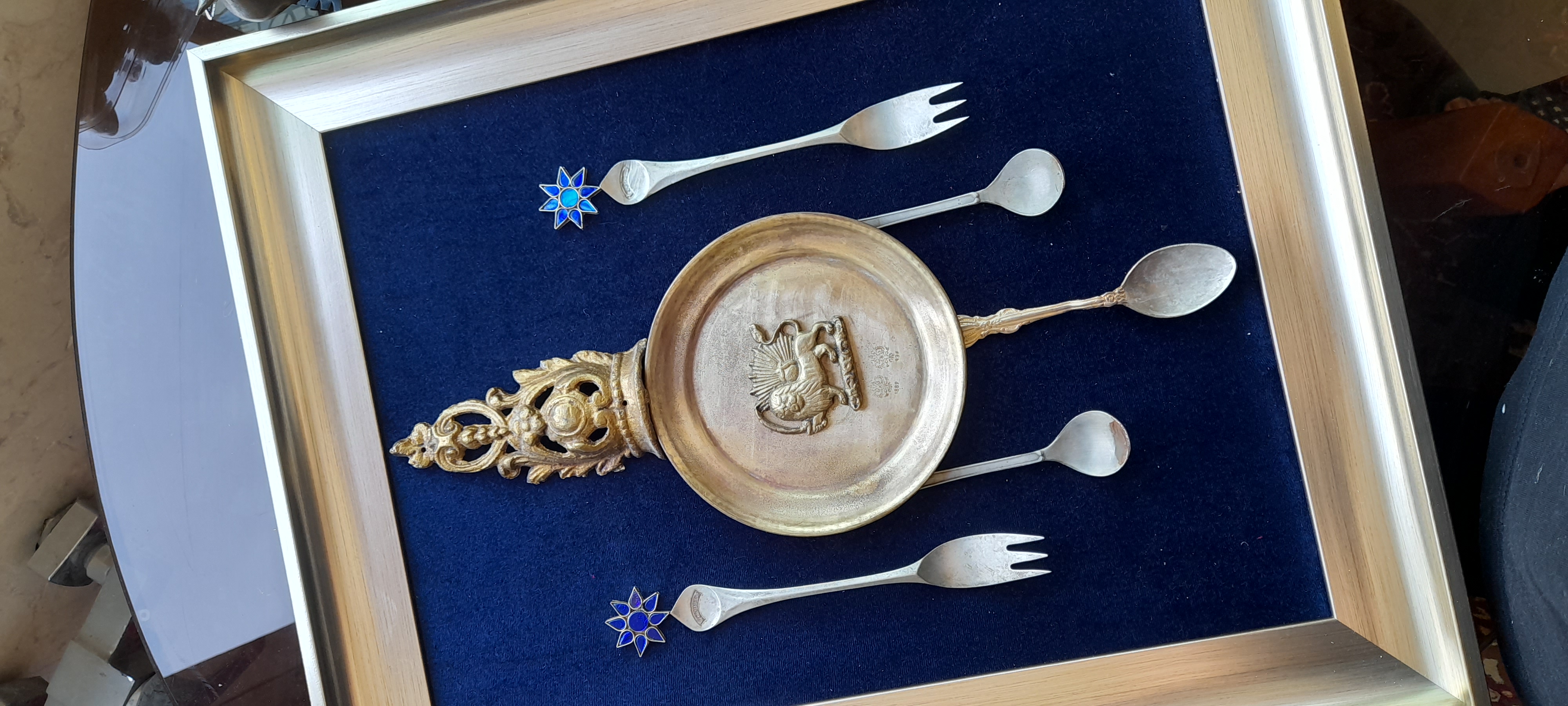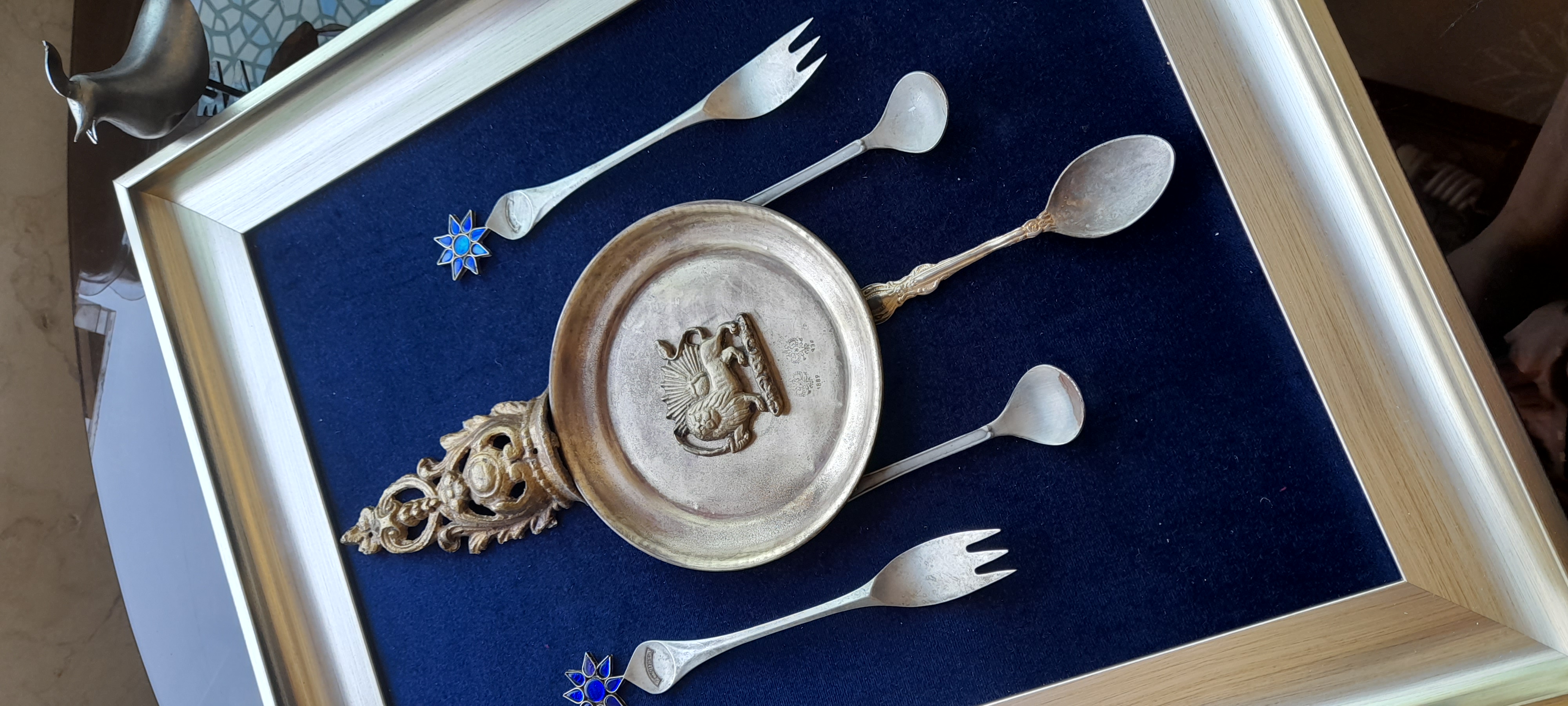 ظروف داخل تابلو با قدمت بالای ۵۰ سال هستن و جنس ظروف برنج مهردار و رنگ مخمل هم سورمه ای است