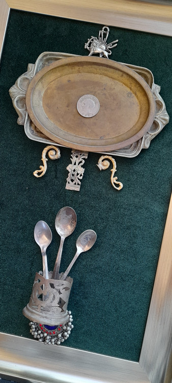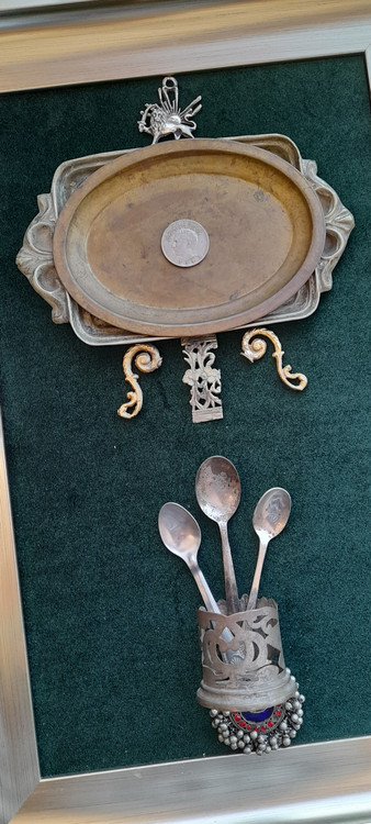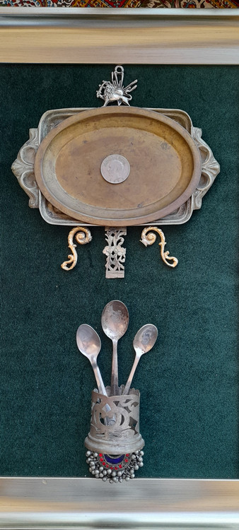 جنس ظروف داخل تابلو برنج هستند با قدمت بالای ۶۰ سال